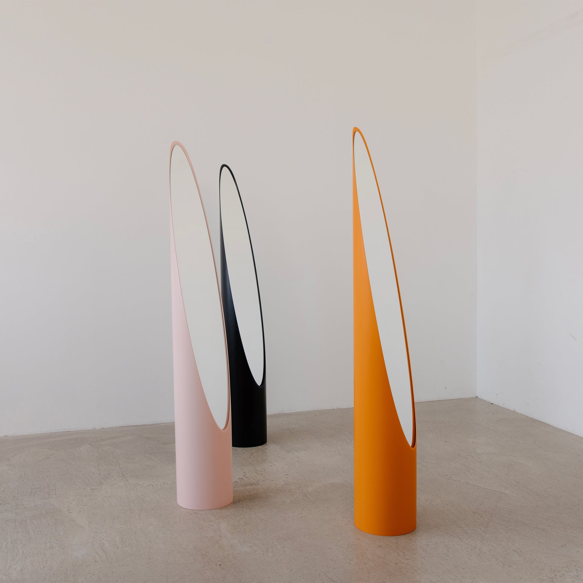 The molded frame is typically finished in high-gloss lacquer, creating a dramatic contrast with the reflective glass. Its biomorphic shape is a nod to the playful yet sophisticated aesthetic of Italian postmodernism, making it a standout piece in any room.