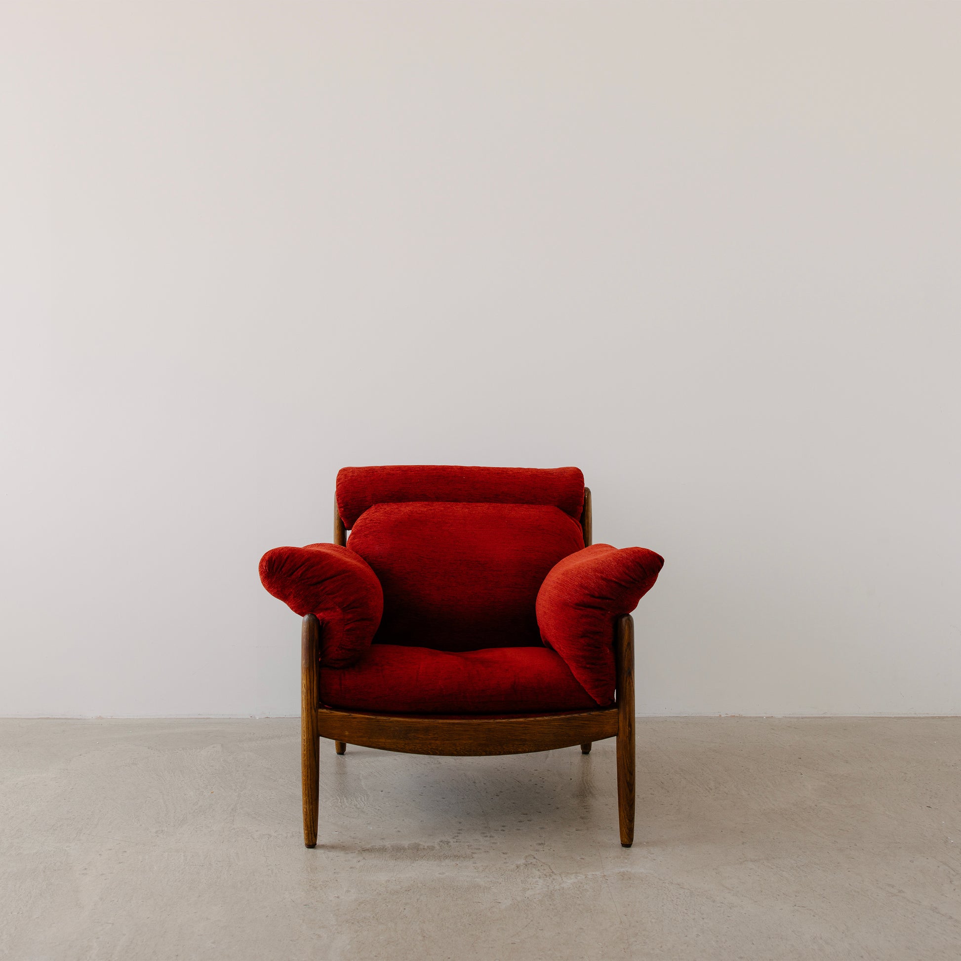 Wonderful armchair attributed to Carl Straub, Denmark, 1960s. Incredible oak construction, upholstery covered with red fabric.