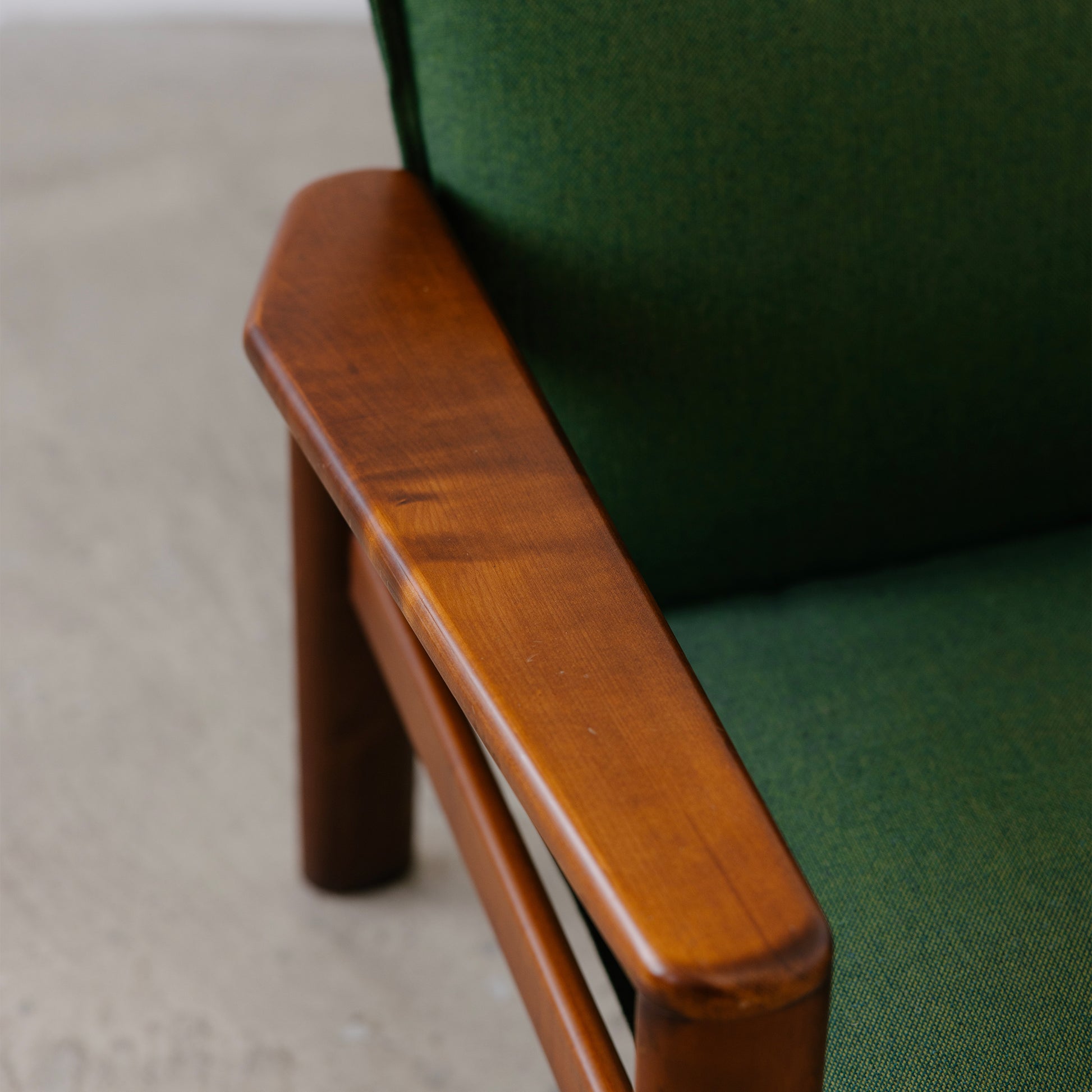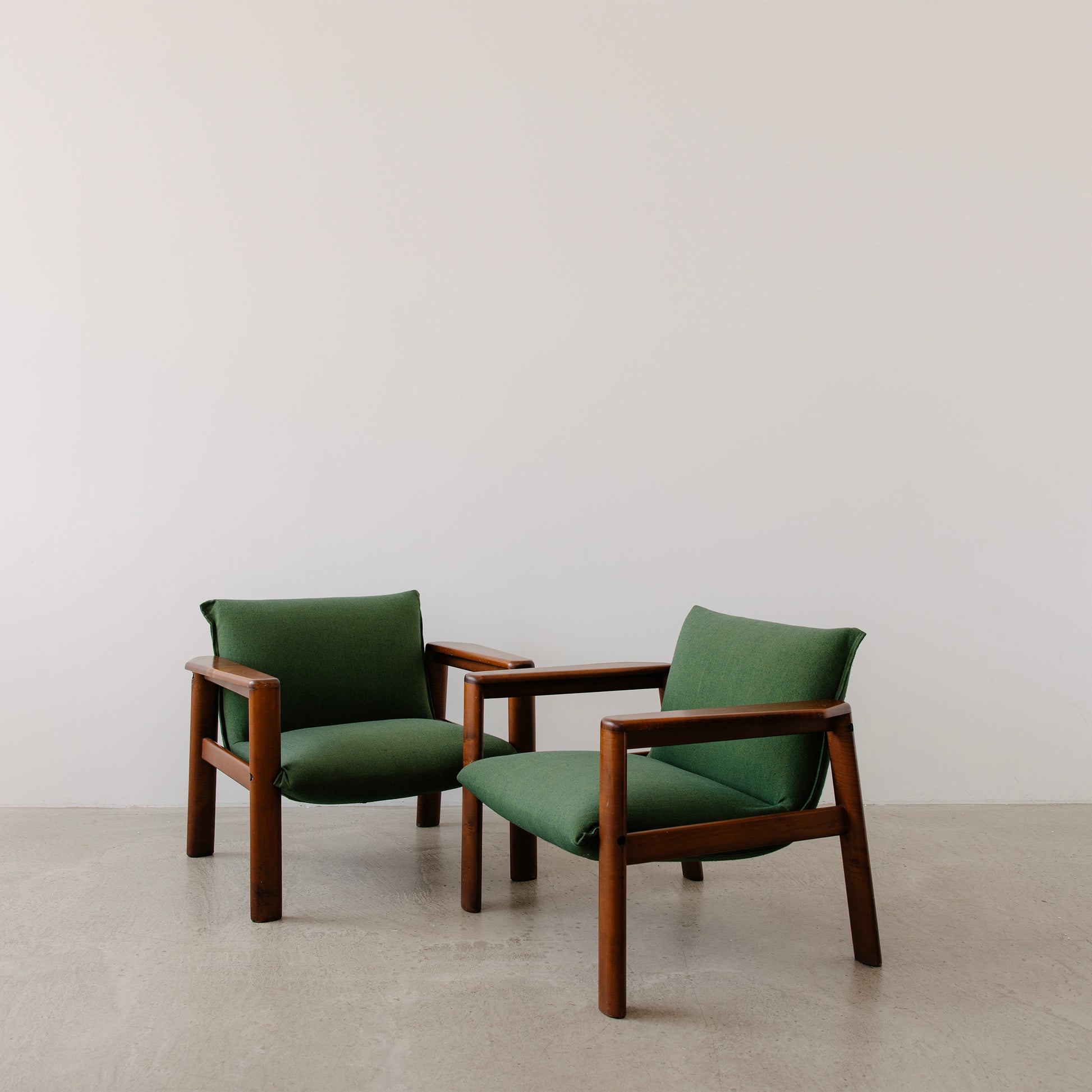 The frames are solid and substantial, crafted from stained wood with a warm tone that beautifully complements the rich green wool upholstery. The cushions are generously padded and lightly structured, offering relaxed support with an understated elegance.