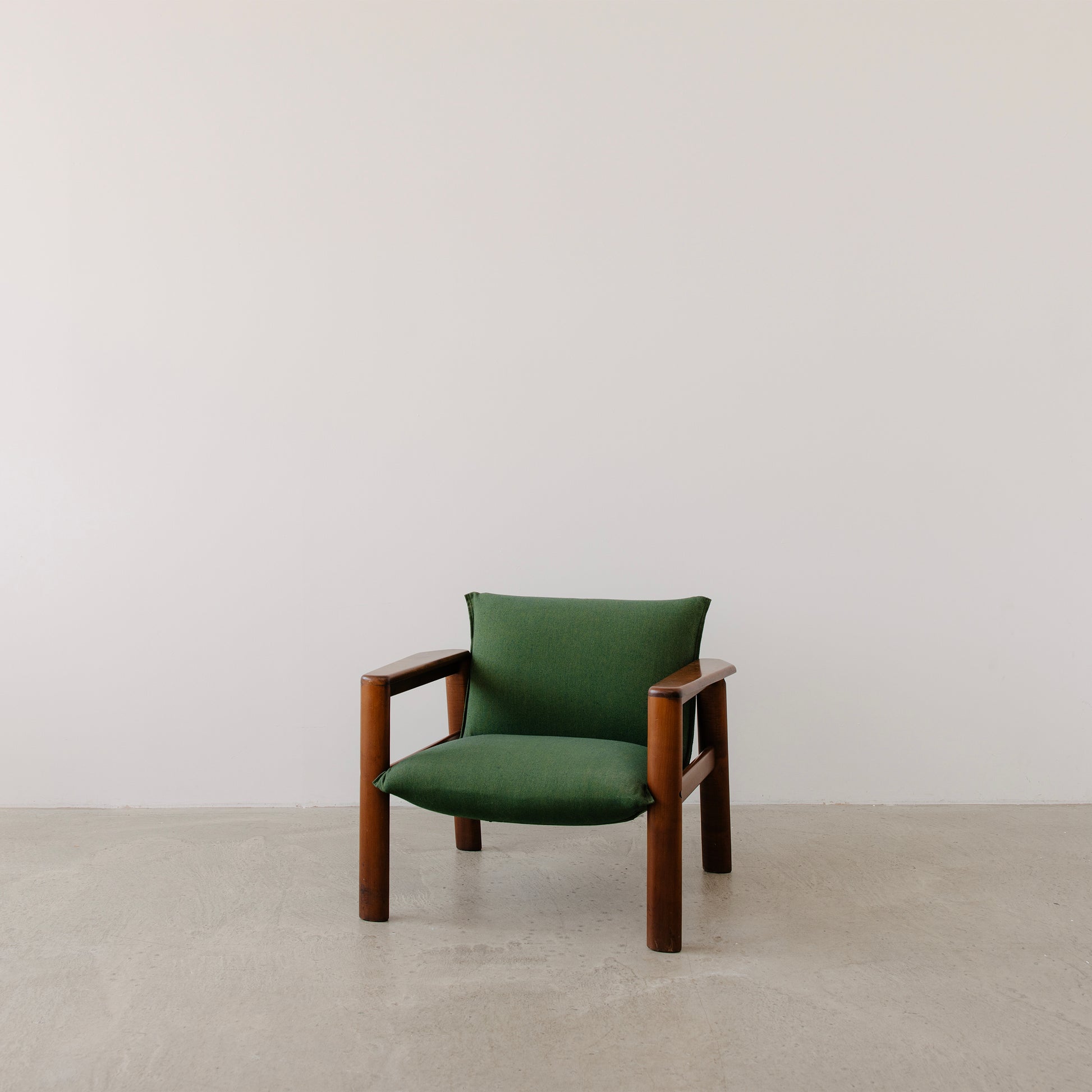 Striking in both form and presence, these vintage Italian lounge chairs offer a bold take on modernist design. Featuring wide, cylindrical wooden legs and sculptural armrests, the chairs blend architectural lines with deep, comfortable proportions.